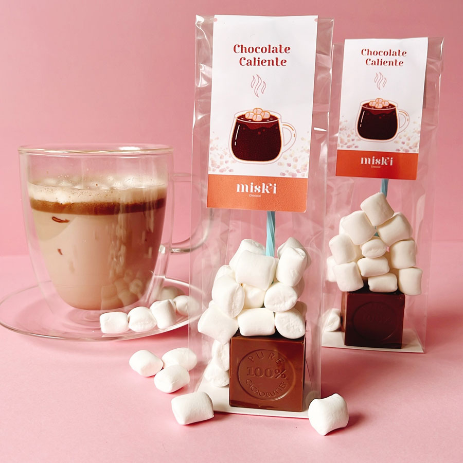 Pack para preparar tres deliciosos chocolates caliente con malvaviscos. Cada unidad contiene 40 grs. de chocolate de leche belga y 12 gr de mini malvaviscos.